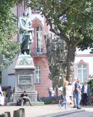 La statue en bronze de Schiller, installée en 1862, tient un livre ouvert et occupe sa position actuelle depuis son déplacement en 1929.