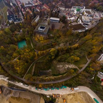 Le Travertinpark est un parc public situé à Bad Cannstatt construit sur une ancienne carrière de calcaire, présentant d'anciens équipements d'extraction, des voies de grues et des rails intégrés dans l'espace vert. Les structures industrielles s'inscrivent dans le paysage, créant un mélange d'éléments naturels et construits.
