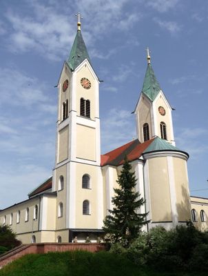 Wallfahrtskirche Maria-Hilf est une église néo-romane qui s'élève sur une colline au sud de Vilsbiburg, dominant la ville par sa façade importante. À l'intérieur, un autel baroque structure l'espace, avec une image vénérée de Marie comme point central.