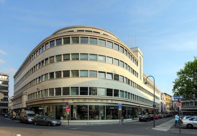 Le Disch-Haus présente des bandes continues de fenêtres et des bandes de travertin sur sa façade d'angle arrondie entre Brückenstraße et Herzogstraße.