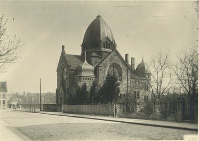 La synagogue, conçue par Louis Blecher, présentait une architecture néoromane avec un dôme central et plusieurs fenêtres ornementales sur Lortzingstrasse.