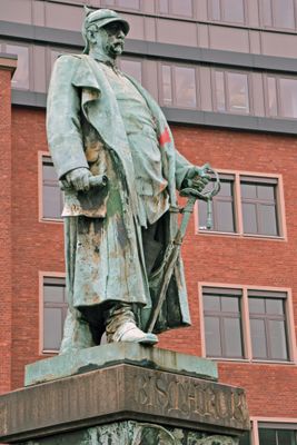 Le Monument Bismarck est une structure en bronze sur la Bismarckplatz présentant une statue de l'ancien chancelier en tenue militaire avec un casque à pointe, mesurant environ 3 mètres de haut sur une base en granit. Le piédestal porte des reliefs sculptés avec des scènes historiques et des images symboliques.