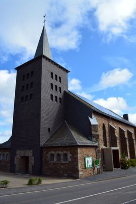 L'église Saint-Hubert présente des éléments architecturaux régionaux traditionnels avec une façade en pierre et des motifs géométriques dans sa conception.