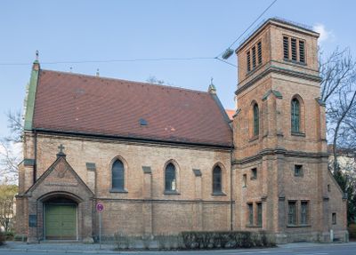 St. Willibrord est une église en brique de style néo-gothique située à la Blumenstraße 36 à Munich, présentant les éléments de conception typiques de l'architecture religieuse allemande du début du 20e siècle. Le bâtiment affiche des lignes verticales, des arcs pointus et des murs en brique rouge qui caractérisent le style néo-gothique.