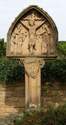 Wayside Shrine am Grain, crucifixion group with the holy Katharina and Barbara, sandstone, at the side two small penitence crosses, 15th or 16th century