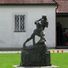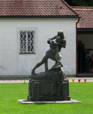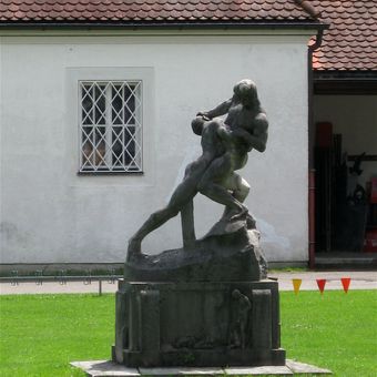 Ringergruppe, Steinskulptur, 1896 von Mathias Gasteiger, auf Sockel mit Flachrelief 1901 vor dem Abschlussgebäude des ehemaligen Jugendturnspielplatzes am Schyrenplatz aufgestellt (jetzt städt. Sportanlage)