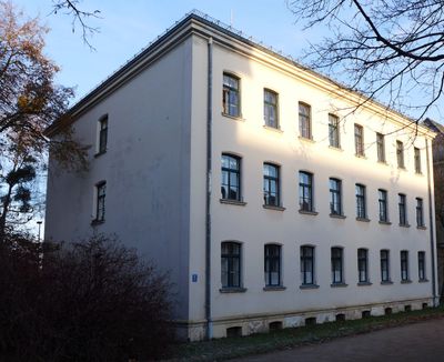Ehemals Militärgebäude, teil des ehemaligen Kasernements des Eisenbahn-Bataillons, dreigeschossiger kubusartiger Block mit flachem Walmdach, errichtet in spätklassizistischen Formen, Ende 19. Jahrhundert