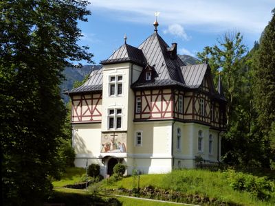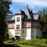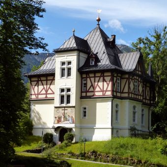 Hillern-Schlössl, reich gegliederter Walmdachbau in Heimatstilformen mit Fachwerk-Obergeschoss, Risaliten, Lauben, Eckerkertürmchen, Putzgliederung und Wandbild, 1886