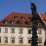 Jakobsbrunnen, oktogonales Brunnenbecken, darin Balustersäule mit Jakobsfigur, Kalkstein, 1644, Figur 1955, Becken 1974 erneuert