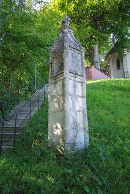 Pfeilerbildstock, sogenannte Totenleuchte, aus Tuffstein, wohl 1. Hälfte 17. Jahrhundert