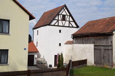 Tour défensive de l'avant-cour, zweigeschossiger Eckturm mit Satteldach und Fachwerkgiebel, im Kern 2. Hälfte 15. Jh., in jüngerer Zeit zum Wohnhaus erweitert, mit Befestigungsmauer, Nordwestecke