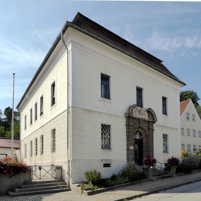 , pfarrhaus, zweigeschossiger neubarocker Mansardwalmdachbau mit Putzgliederung und prächtigem Portal, 1897