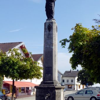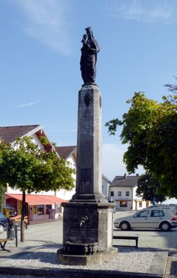 , mariensäule, neubarocke Marienfigur auf steinernem säulenartigem Steinsockel mit Brunnentrog, Ende 19. Jahrhundert