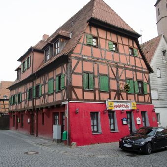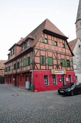 Knörrgasse 2, zweigeschossiger Krüppelwalmdachbau, Stockwerkbau mit vorkragendem Obergeschoss und verblatteten Streben, 1426 (dendrochronologisch datiert)