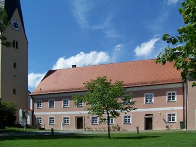 Pfarrhof, zweigeschossiger Satteldachbau mit Halbwalm, über hakenförmigem Grundriss, 18. Jahrhundert