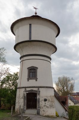 Wasserturm in Rain, konischer Rundbau mit ausladendem Behälter und neuklassizistischen Gliederungselementen, 1903