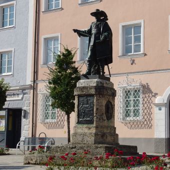 Tilly-Denkmal, auf gestuftem Postament die Figur Johann ’t Serclaes von Tilly, von Hygin Kiene nach einem Entwurf von Anton Kaindl (Bildhauer), 1914