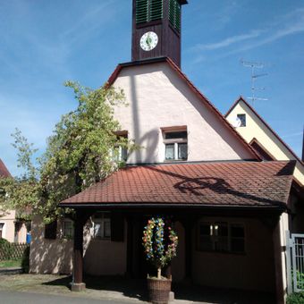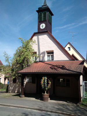 Ehemalige Schmiede, eingeschossiger Satteldachbau mit hölzernem Uhr- und Glockentürmchen, rückseitig Fachwerk, im Übrigen verputzt, mit rückseitigem Seitenflügel und offenem Fachwerk-Vorbau mit Pultdach, 18./19. Jahrhundert
