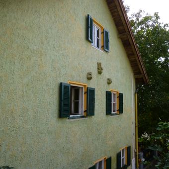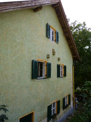 Obere Bergstraße 18, drei spätgotische Giebelkonsolen mit den reliefierten Brustbildern St. Petrus, St. Johannes Evangelist und St. Jakobus dem Älteren, Stein, Ende 15. Jahrhundert; an der nördlichen Giebelwand eingemauert