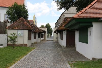 Verkaufshäuschen für Devotionalien, neun Bauten mit vorspringenden Walm- oder Satteldächern, 19. Jahrhundert, zu beiden Seiten des Wallfahrerweges