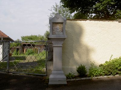 Kreuzweg, 14 Stationen, Pfeiler mit Satteldach und Reliefs, Granit und Ton, bezeichnet mit 1912