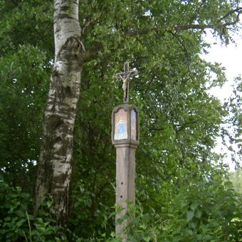 Schlossbergmarterl, schlanker Granitschaft auf Postament, Laterne allseitig mit Bildfeldern, Granit, bezeichnet mit „1779“, Gusseisenkruzifix 19. Jahrhundert