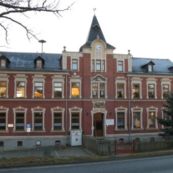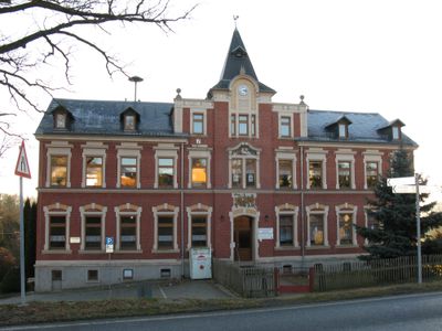 Großfriesener Schule Falkensteiner Landstraße 26, Alte Dorfschule Großfriesen, repräsentativer späthistoristischer Klinkerbau, von bau- und ortshistorischer Relevanz.<br> zweigeschossiger roter Klinkerbau von zehn Achsen, mit gerade stuckverdachten Fenstern 1. Obergeschoss bzw. Klinkerbogen im Er