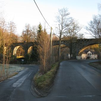 Viadukt Kleinfriesen Falkensteiner Straße, Die fünfJoch (Bauteil) landschaftsprägende Brücke in der Nähe der Rangmühle ist rund 120 Meter lang, rund 15 Meter hoch und etwa 4,5 Meter breit. Das Viadukt]] über den Friesenbach war früher Teil der mittlerweile demontierten [[Bahnstrecke Lo