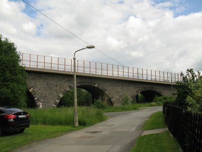 Friesenbachtalbrücke Bundesautobahn 72, Die siebenjochige Steinbogenbrücke ist 200 Meter lang und 16 Meter hoch. Die Brücke wurde mit Fruchtschiefer verkleidet und dient mit neuer Betonauflage heute als Autobahnbrücke über den Friesenbach