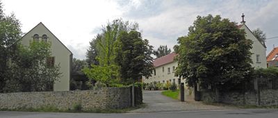 Pfarrhaus, Reste der Einfriedungsmauer mit Tor sowie Pfarrgarten Langebrücker Straße 2