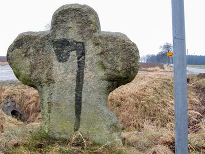 Sühnekreuz Alte Treuener Straße, Mit eingeritzter Axt, ortsgeschichtlich von Bedeutung. Granit, 58 x 100 x 20