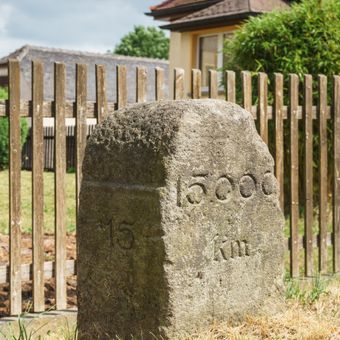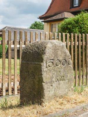 Streckenmarkierungsstein Nr. 15, Sandstein, verkehrsgeschichtlich von Bedeutung. bezeichnet: 15 15.000 km 16