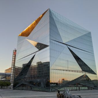 Cube berlin est un bâtiment de bureaux contemporain situé à Europacity près de la gare centrale, caractérisé par une façade de verre réfléchissante. L'enveloppe extérieure double avec une cavité d'air variable entre les couches soutient la ventilation naturelle et la gestion efficace de la température.
