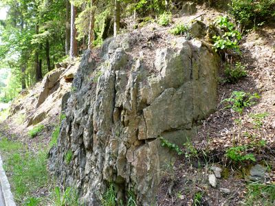 Straßenaufschluss am Aigenberg, Störungszone im Landkreis Straubing-Bogen in Bayern