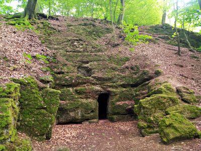 L'Eremitenklause est une eglise-grotte et ermitage sculpte dans le roc au nord-ouest de Hahnweilerhof. L'interieur mesure environ quatre par trois metres avec une voute a nervures taillee directement dans la pierre.