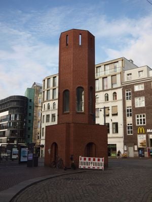 Le Verkehrsturm à Domsheide présente une structure octogonale avec des fenêtres cintrées élevées sur une base carrée de quatre mètres en briques rouges.