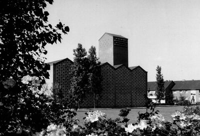 La Herz-Jesu-Kirche présentait une conception moderniste avec un toit de type industriel et une tour asymétrique sur son côté ouest.