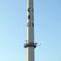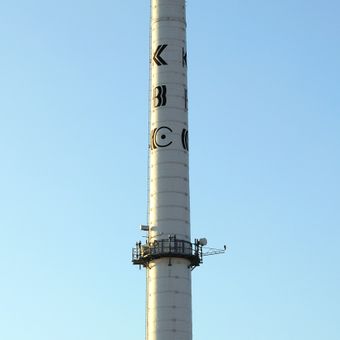KBC-Schornstein est une cheminée industrielle de 85 mètres en béton blanc avec des lettres verticales noires au centre de Lörrach. Trois plateformes métalliques entourent la structure effilée à différentes hauteurs.