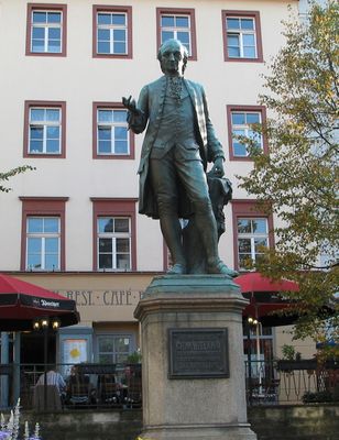 La statue en bronze représente Christoph Martin Wieland tenant son œuvre Oberon, située à l'intersection des rues Marienstrasse et Frauenstrasse.
