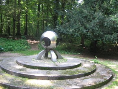 La fontaine circulaire dans la forêt illustre l'architecture allemande des sources naturelles du milieu du XXe siècle.