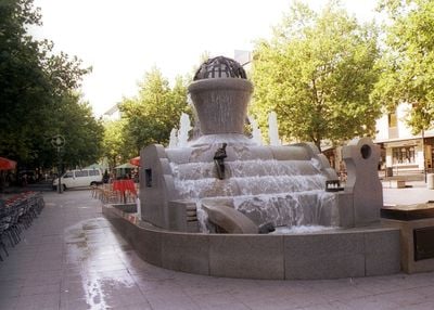 La fontaine marque le debut de la zone pietonne commerciale avec des bords larges qui sont bons pour s'asseoir et se reposer. Elle sert de point de rencontre naturel pour les visiteurs explorant les rues environnantes.