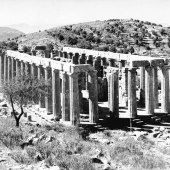 Le Temple d'Apollon Épicurien se dresse sur le mont Kotylion à environ 1.131 mètres d'altitude et a été construit en calcaire gris arcadien. La structure s'étend sur le flanc de la montagne avec le sanctuaire interne comme élément central, entouré de halls à colonnes et d'espaces qui révèlent son objectif d'origine en tant que lieu de culte.