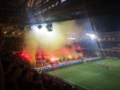 Les spectateurs accèdent par des entrées dédiées via un système de billetterie numérique, avec des sections distinctes pour supporters locaux, visiteurs et médias.