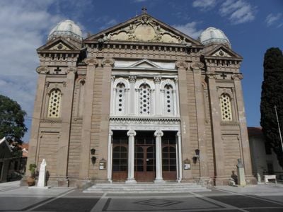 L'église Saint-Thérapon présente un grand dôme central dominant les structures voisines, avec des éléments gothiques et des motifs décoratifs de Nikolaos Kesanlis.