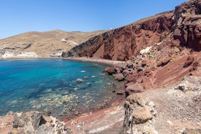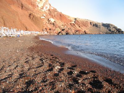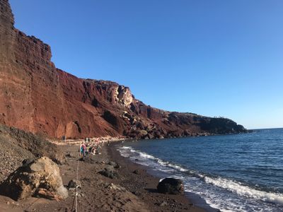 La formation de la plage provient de l'activité volcanique à Santorin, qui a déposé des sédiments riches en fer et créé les falaises rouges.