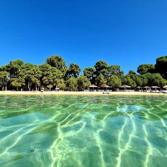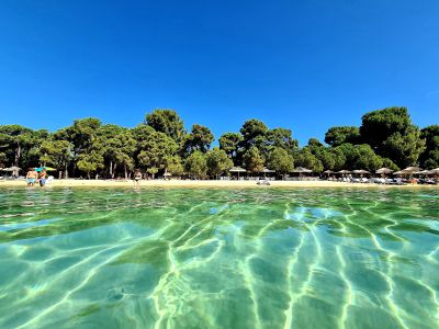 Koukounaries est une plage de sable sur la côte sud-ouest de Skiathos, où le sable clair rencontre d'épaisses forêts de pins qui s'étendent presque jusqu'à l'eau. Le rivage est large et en pente douce vers la mer, ce qui rend la baignade confortable pour les visiteurs de différents niveaux.