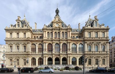 Le Palais de la Bourse est un palais de style Renaissance Revival dans le 2e arrondissement de Lyon avec quatre pavillons aux angles entourant une vaste salle centrale. Le bâtiment présente un travail sculptural élaboré et des décorations en pierre sur toute sa façade et ses espaces intérieurs.
