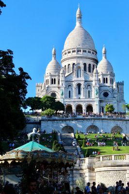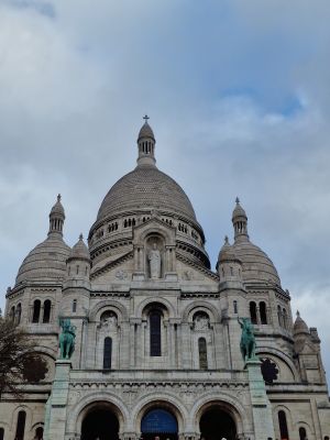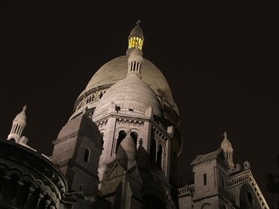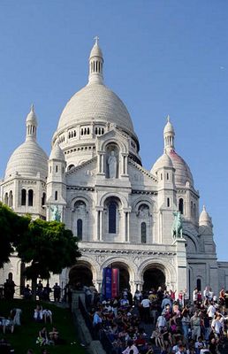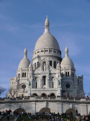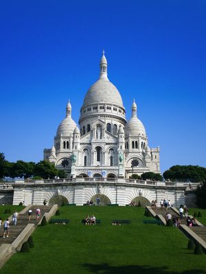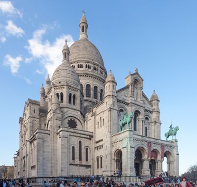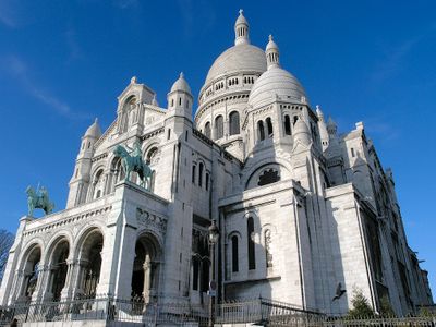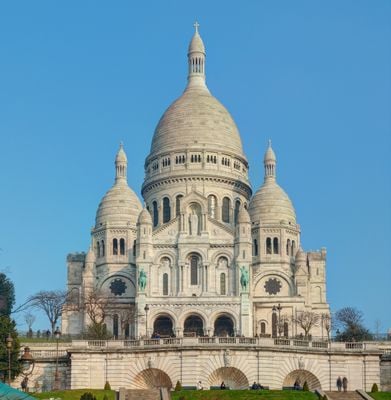 Le Sacré-Cœur associe architecture romane et byzantine avec une façade en travertin blanc et s'élève à 83 mètres au-dessus du quartier de Montmartre.