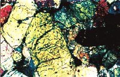 La météorite Chassigny contient principalement des cristaux d'olivine avec des quantités mineures de pyroxène, feldspath et minéraux oxydés.