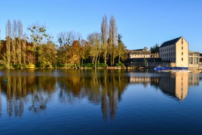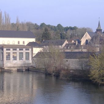 Le monastère se dresse sur les rives de la Mayenne, occupant le site d'un ancien oppidum gaulois avec des bâtiments en pierre et des jardins.